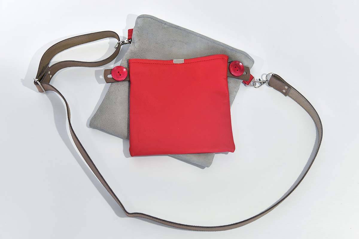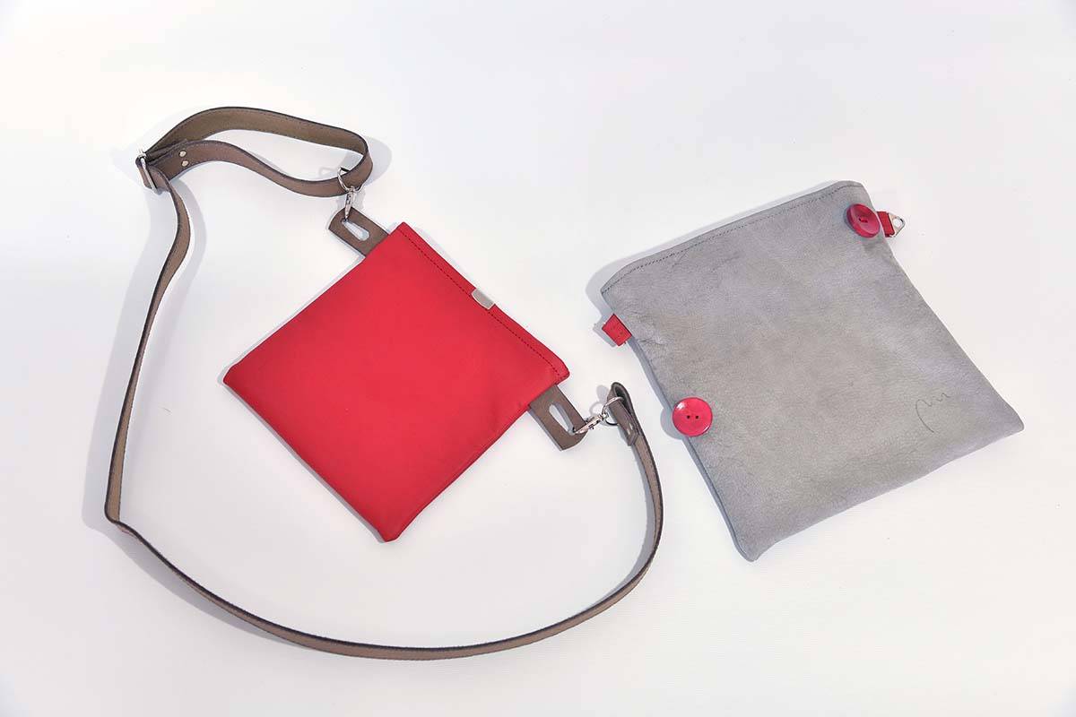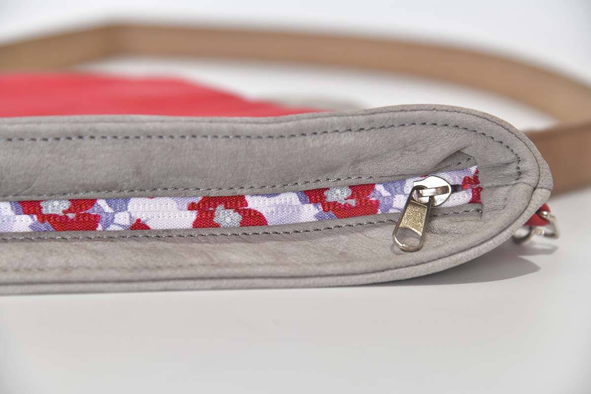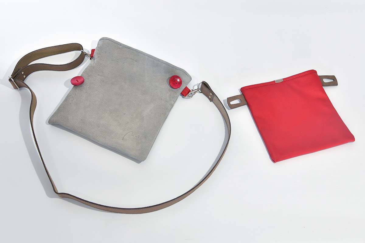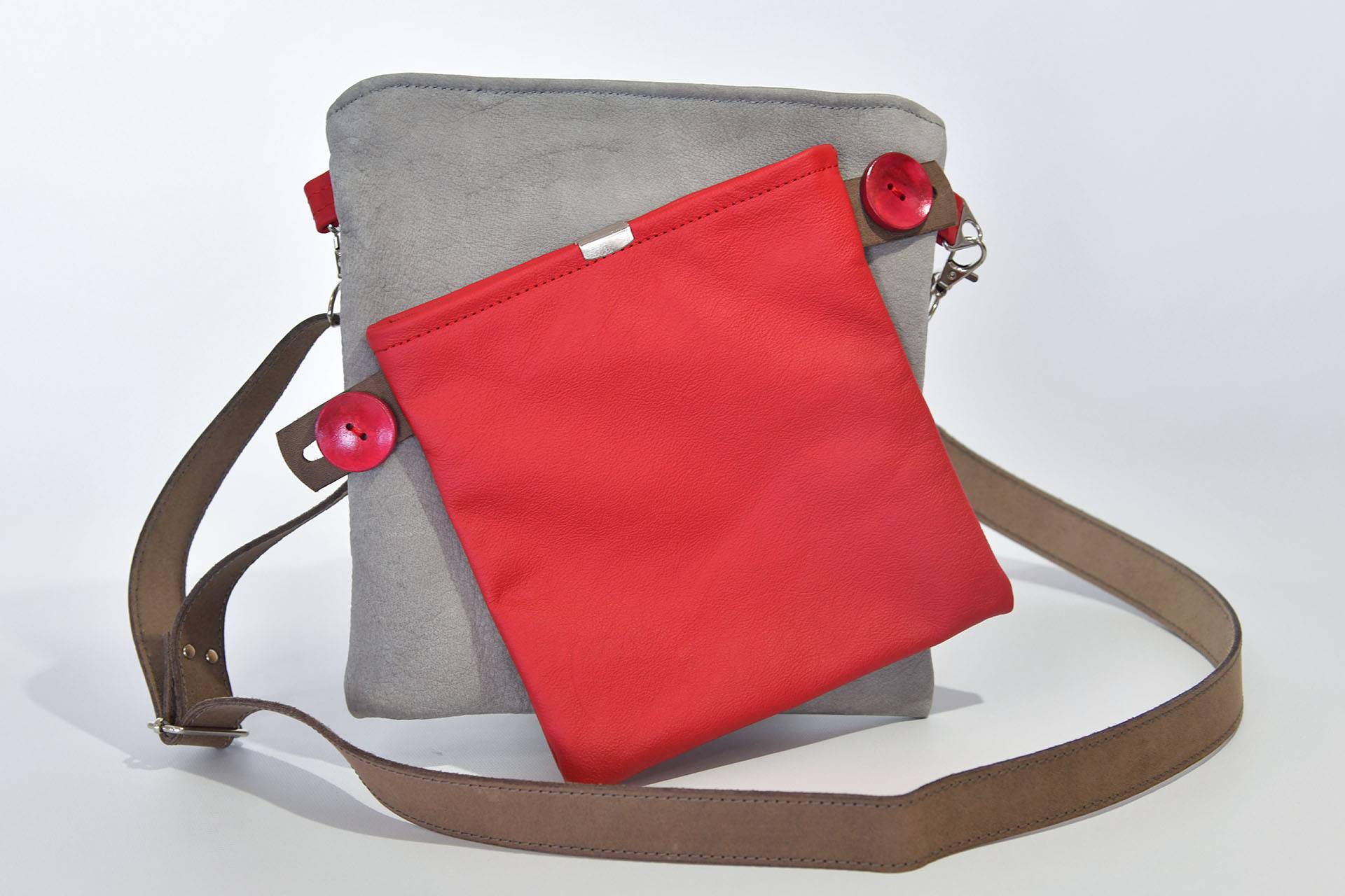 Nubuk and Nappa water buffalo leather in light grey and red with a grey-brown thick leather shoulder belt