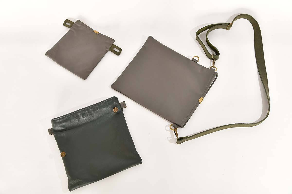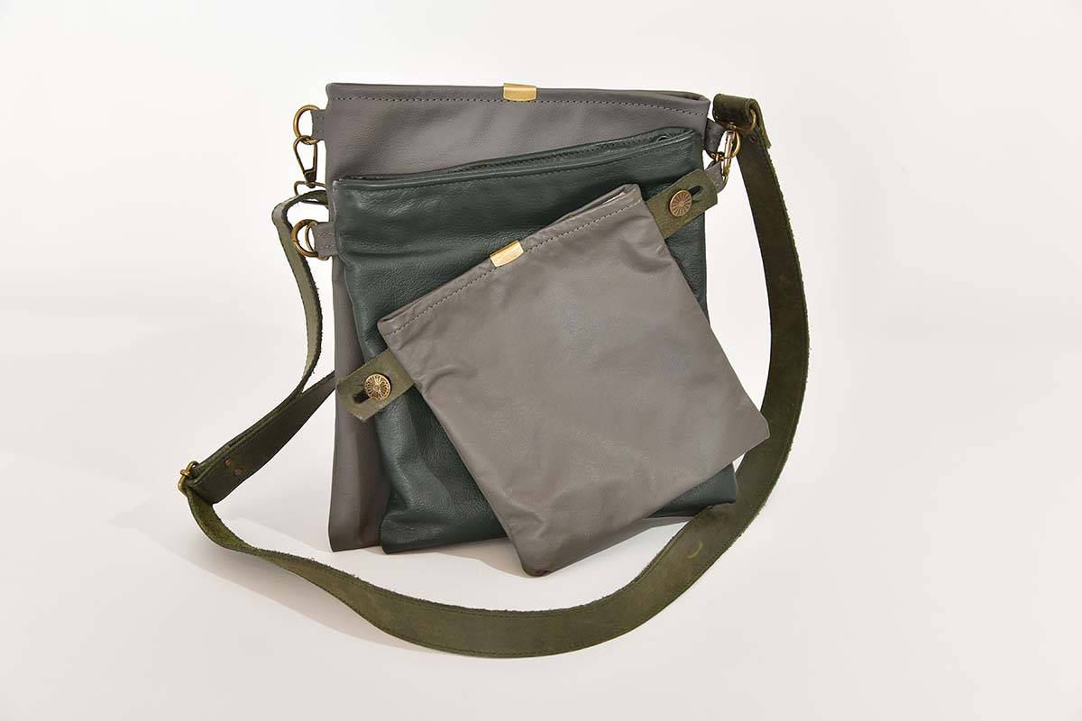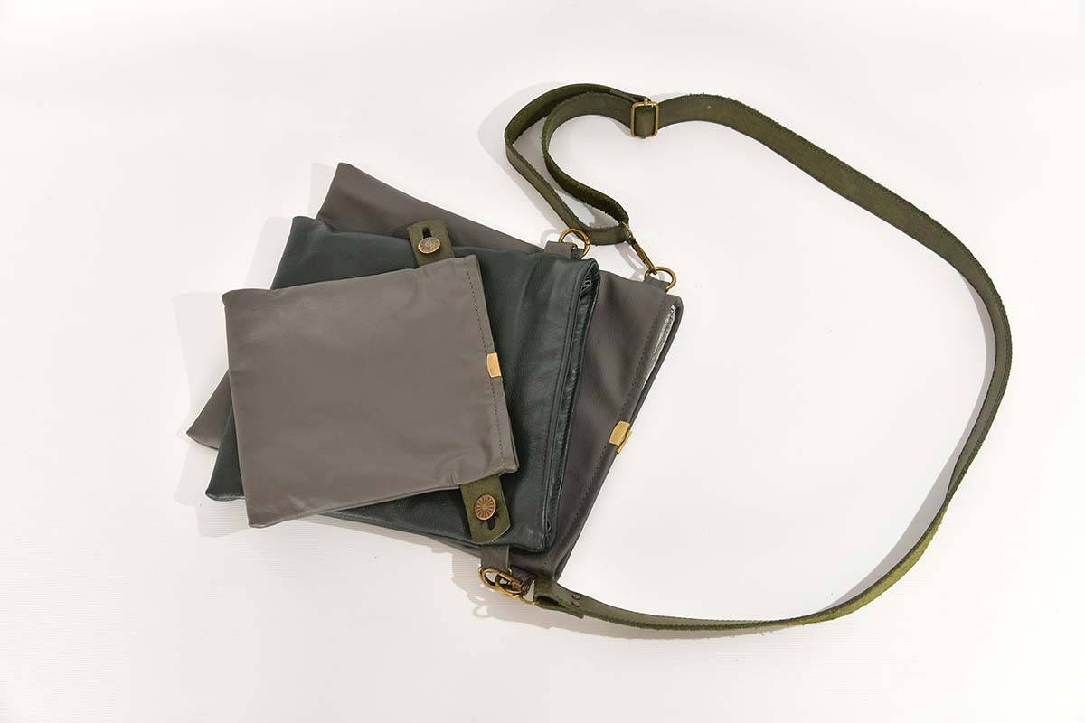 Nappa and Nubuk cow and water buffalo leather in green and light grey with a grey-brown thick leather shoulder belt